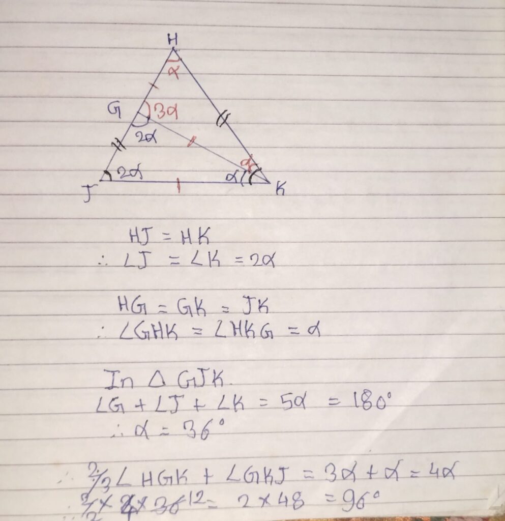 In a triangle HJK, HJ = HK. G is a point on HJ such that HG = GK = JK. What is the degree measure of two-third of (∠HGK + ∠GKJ)?